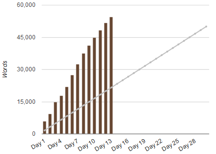 The Words: 2718 written today. It’s the first day after I reached 50k, and it’s not a good sign of things to come. However, I pulled double writing duty today. On top of the writing I did for NaNoWriMo, I had a Skype meeting with my sisters (fifteenth meeting of the Tri-County Sisterhood of the Traveling Book), who are working with me to revise the novel I wrote last year. That was during my evening writing time, so I knew I wouldn’t get writing done during that time. So the rest of the writing happened in the afternoon, which I think was actually a pretty good amount.