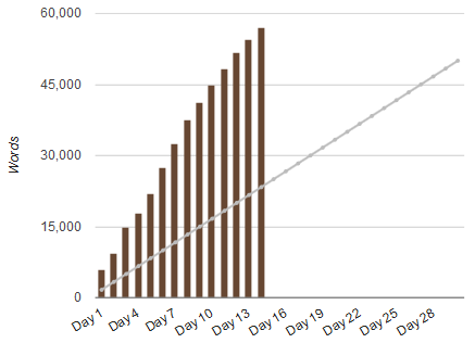 The Words: 2452 written today. Now I can admit that reaching 50k already has made me lazy. I did have a somewhat full day today, but when evening came, I didn’t go directly to writing. So I used up more of my lead. I do plan to stay up late tonight and get extra words for Saturday though.