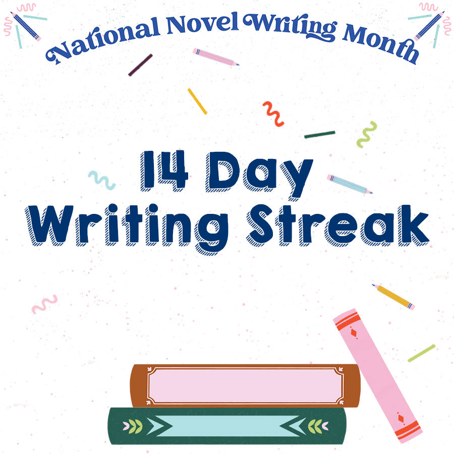 The Words: 1353 total words, done during 2 sprints with my daughter early in the evening. I decided not to go for more. It’s definitely been a slower-paced NaNo for me this year.