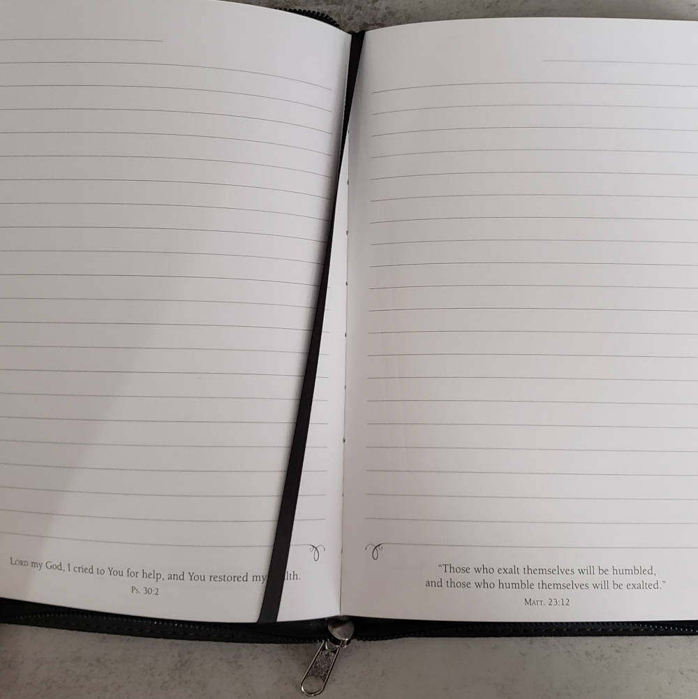 My husband bought me this notebook at Walmart. It stood out to him because it’s the exact same cover as a Bible cover we had recently seen in a gift shop at the Ark Encounter and considered buying for him. It even has a zipper around the edge to keep it closed, like the Bible cover did and has a ribbon bookmark inside with Bible verses on the pages.