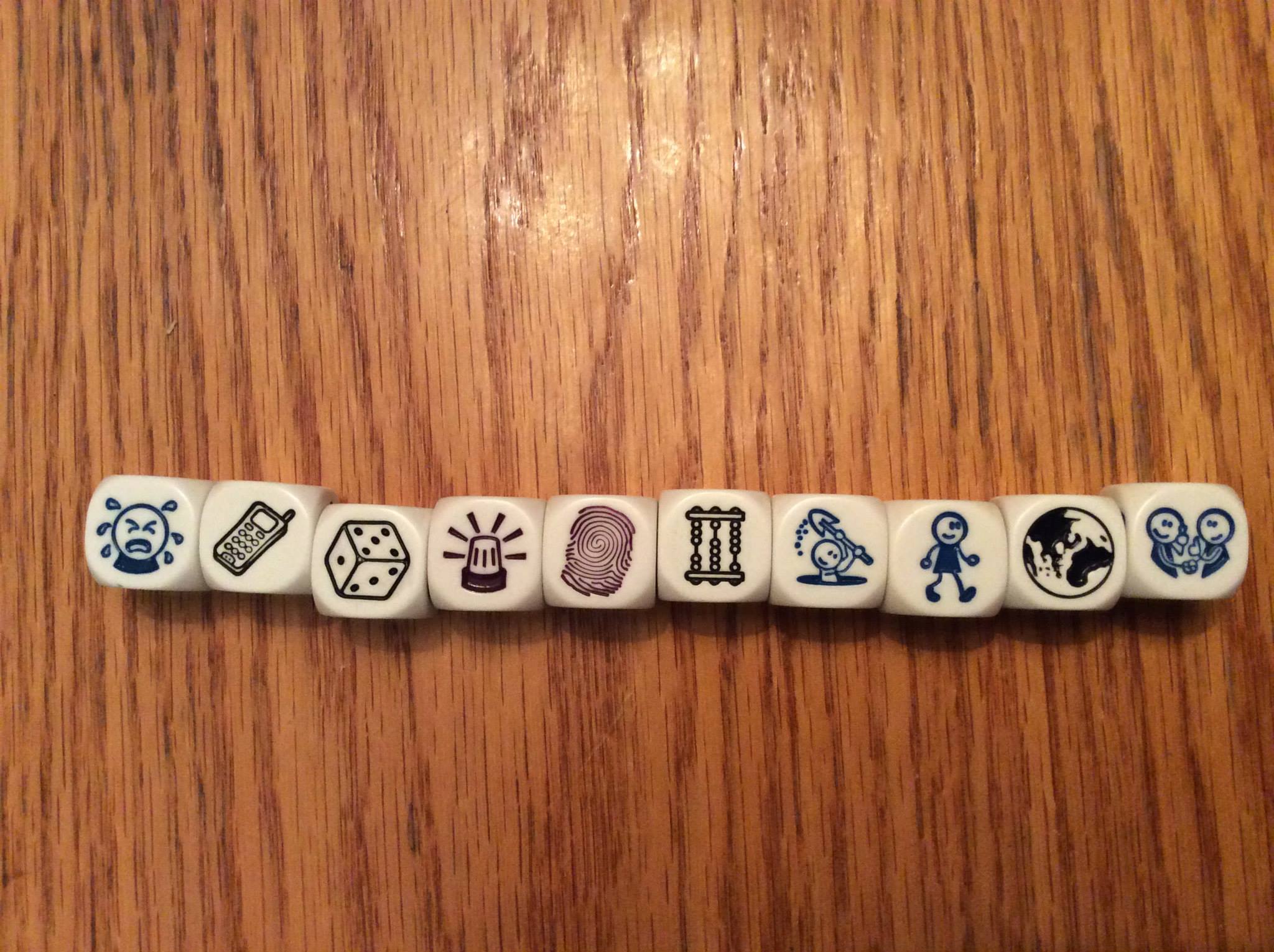 So when I went on my writer’s retreat, I took the cubes and tried out using them alone. The method I chose was simply to mix all the dice together (we have 4 sets), choose one without looking, and roll it. Then I wrote a line or two based on the image. I proceeded to do this until i felt I had reached an adequate ending. That took 21 out of the 30 dice.